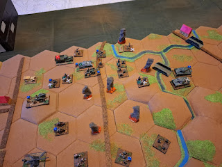 This scenario is essentially a WW1 battle with more modern tanks and planes, and any high intensity battle will have a prolonged attritional segment before things open up and start moving a bit. One thing I was very pleased with was the way the game settled down into a series of formal assaults with the occasional pursuit and advance to contact and an even more occasional breakthrough and exploitation. I want to try it in a more open environment, probably the desert, for which I'll drag out my well playtested Operation Battleaxe scenario. I think re-running Crusader or Gazala might be a bit much at present. Who knows, if I play it enough I might even feel confident enough to play with other humans.
